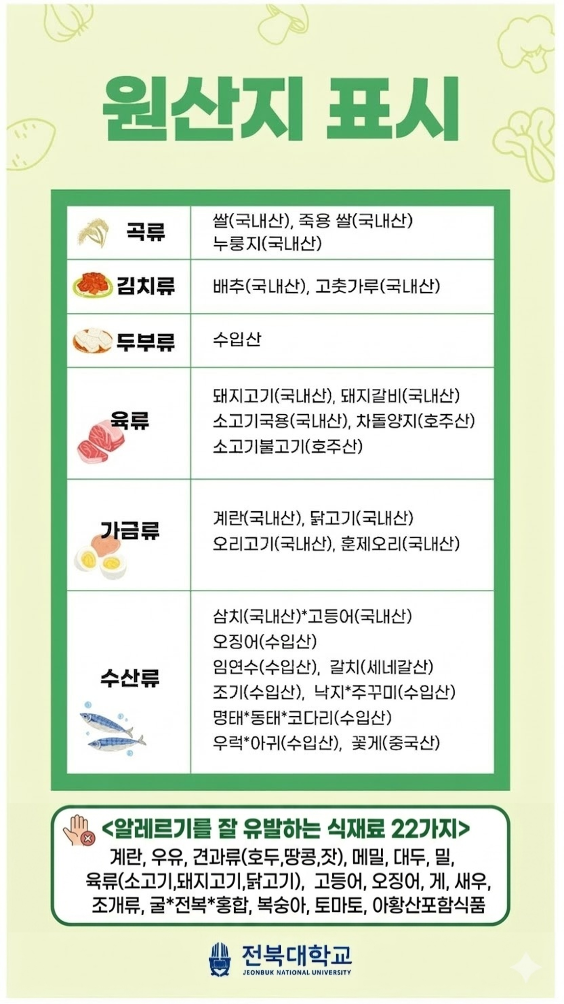 • 실파장국, 닭갈비볶음밥, 소떡소떡꼬치, 들기름막국수, 포기김치, 요구르트