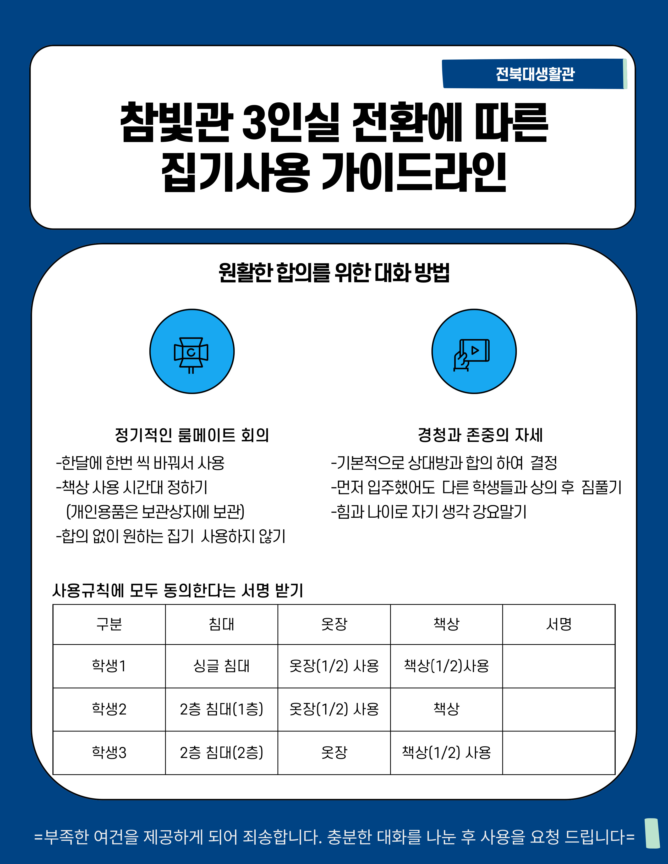 참빛관 3인실 전환에 따른 집기사용 가이드 라인