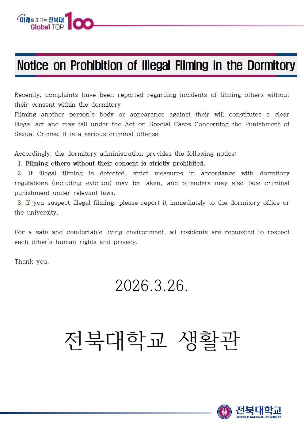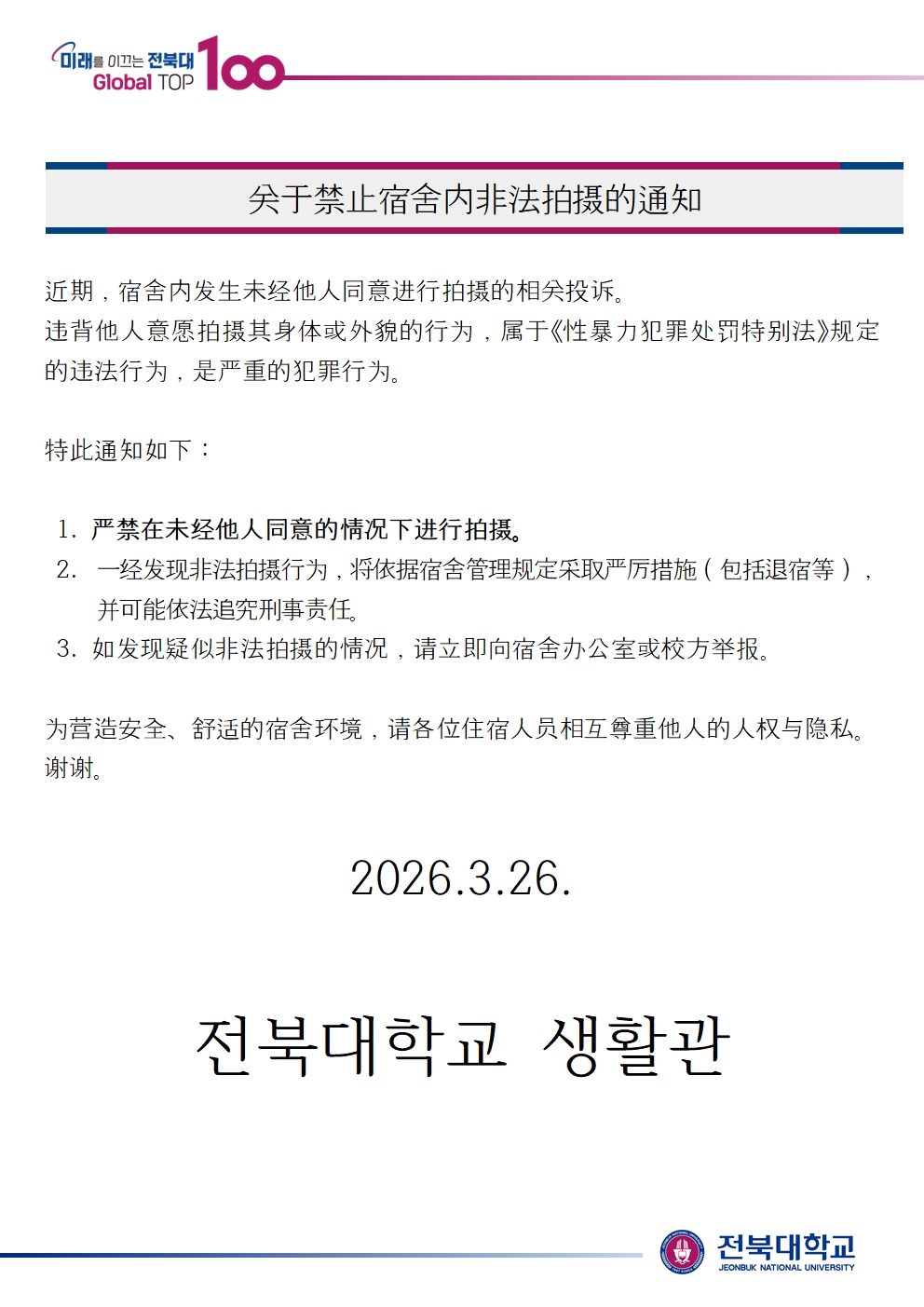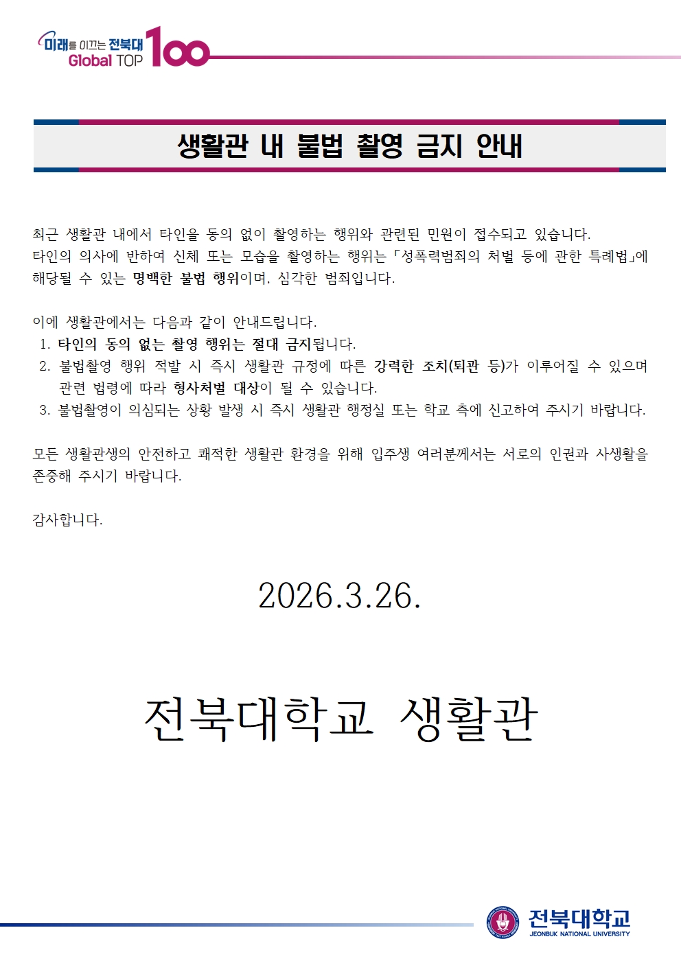 생활관 내 불법 촬영 금지 안내
