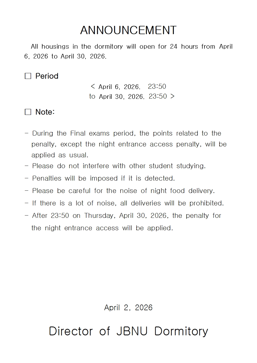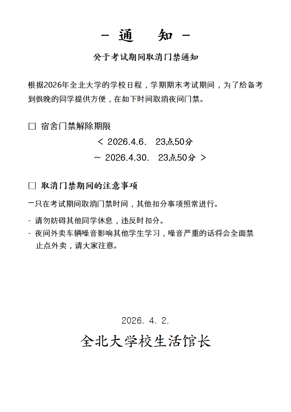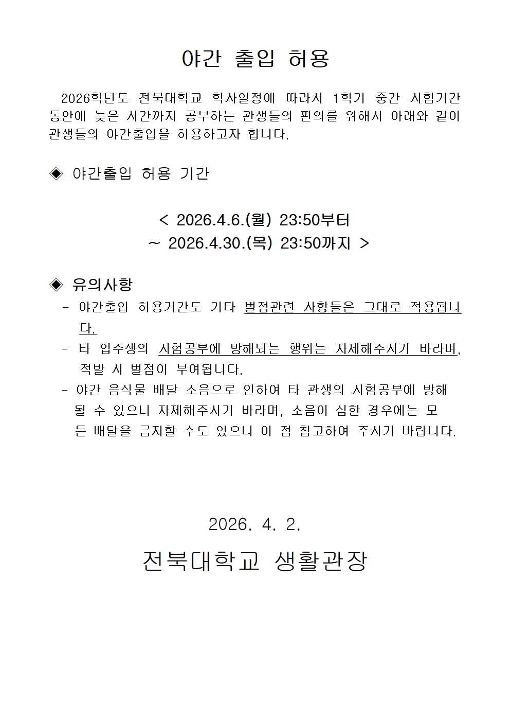 2026학년도 1학기 중간고사 야간출입허용 안내