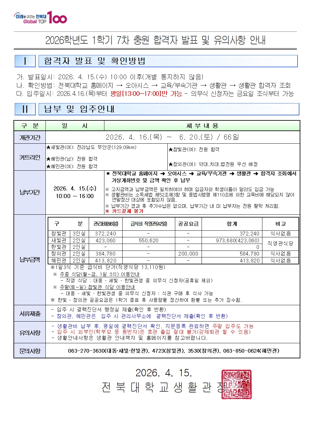 2026학년도 1학기 7차 충원 합격자 발표 및 유의사항 안내