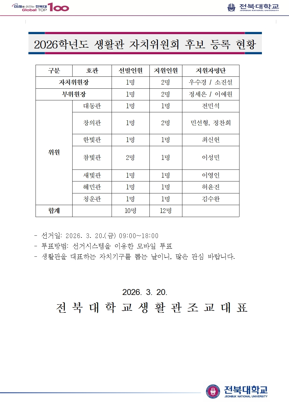 2026학년도 생활관 자치위원회 후보등록 현황