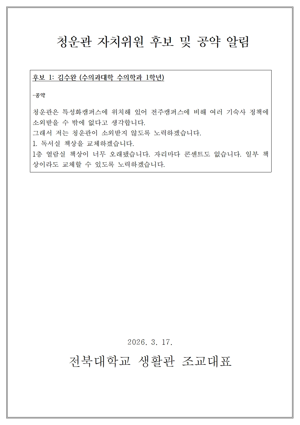 2026학년도 청운관 자치위원 후보 및 공약 알림