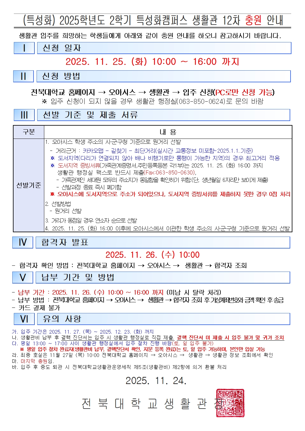 2025학년도 2학기 특성화캠퍼스 생활관 12차 충원 안내