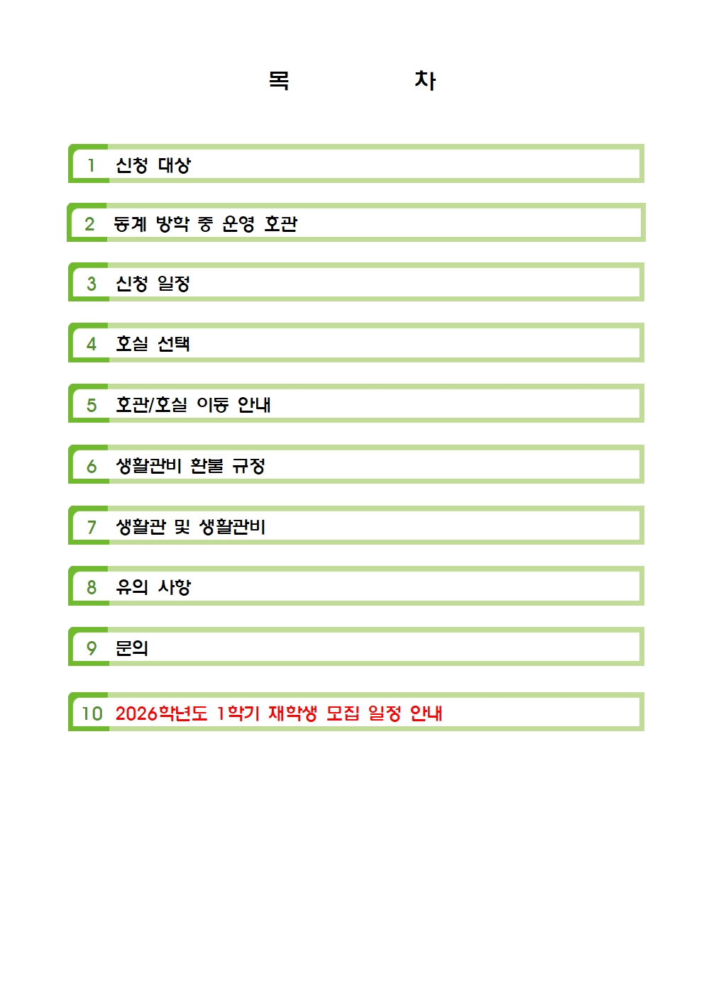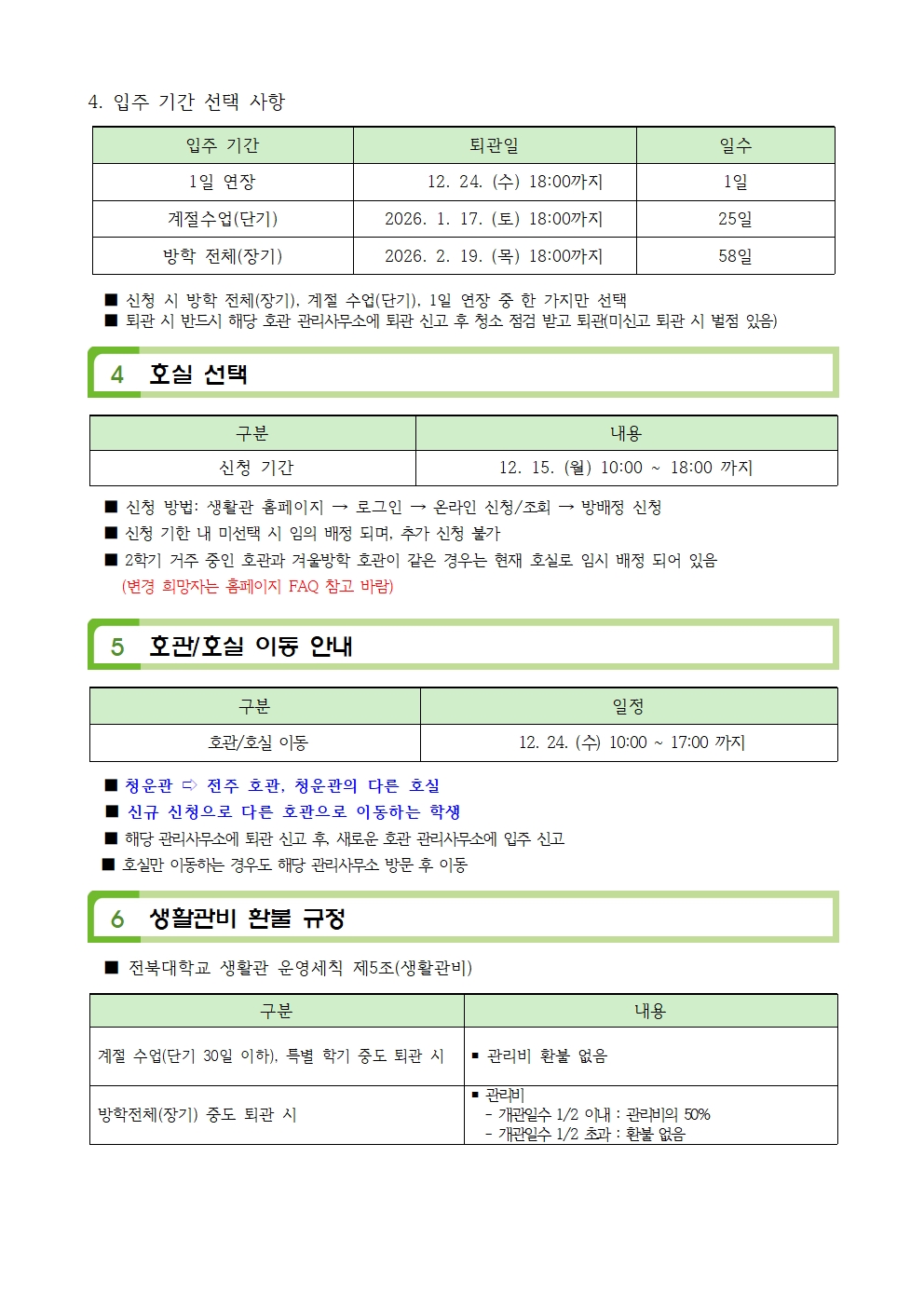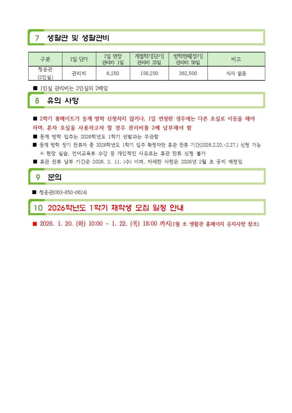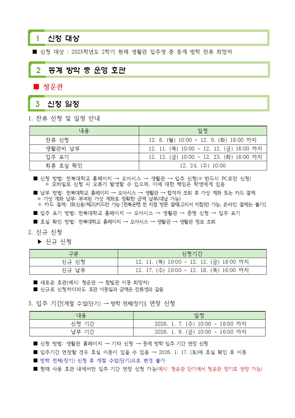 특성화캠퍼스 생활관 2025학년도 동계방학 잔류생 모집 안내