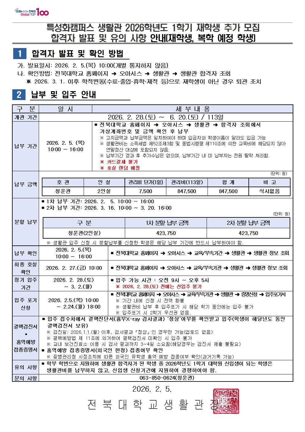 특성화캠퍼스 생활관 2026학년도 1학기 재학생 추가 모집 합격자 발표 및 유의 사항 안내(재학생, 복학 예정 학생)