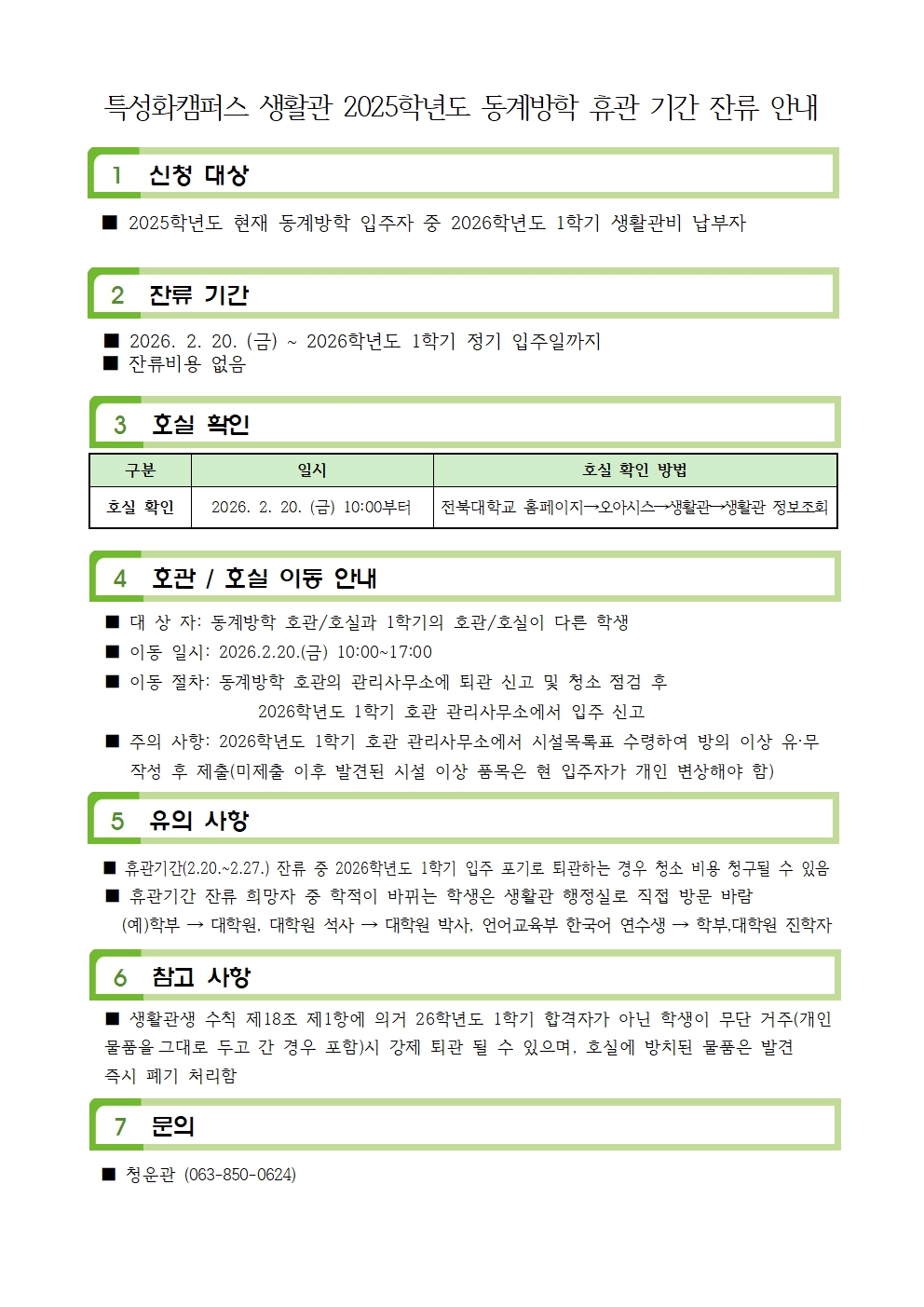 특성화캠퍼스 생활관 2025학년도 동계방학 휴관 기간 잔류 안내(1학기 생활관비 납부자만 가능)