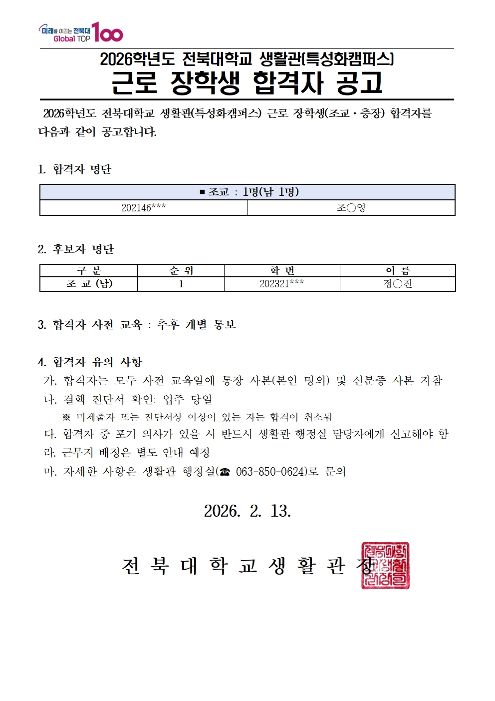 2026학년도 전북대학교 생활관(특성화캠퍼스) 근로 장학생 합격자 공고