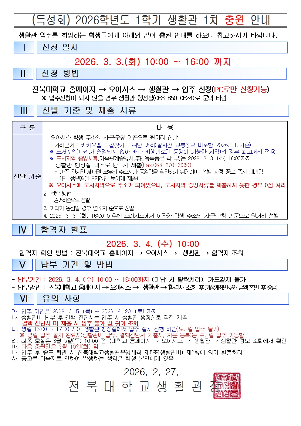 (특성화) 2026학년도 1학기 생활관 1차 충원 안내
