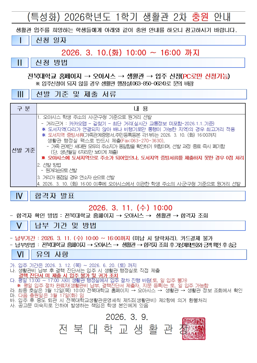 (특성화) 2026학년도 1학기 생활관 2차 충원 안내
