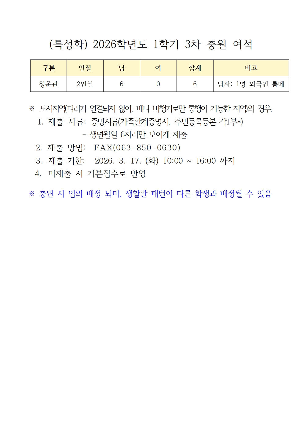(특성화) 2026학년도 1학기 3차 충원 여석