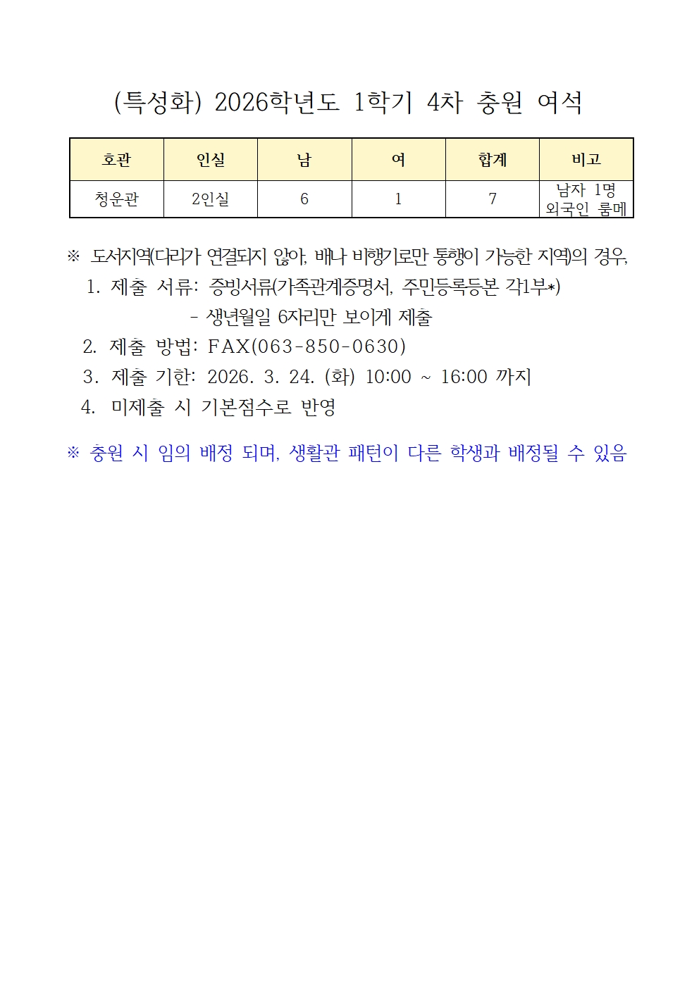 (특성화) 2026학년도 1학기 4차 충원 여석
