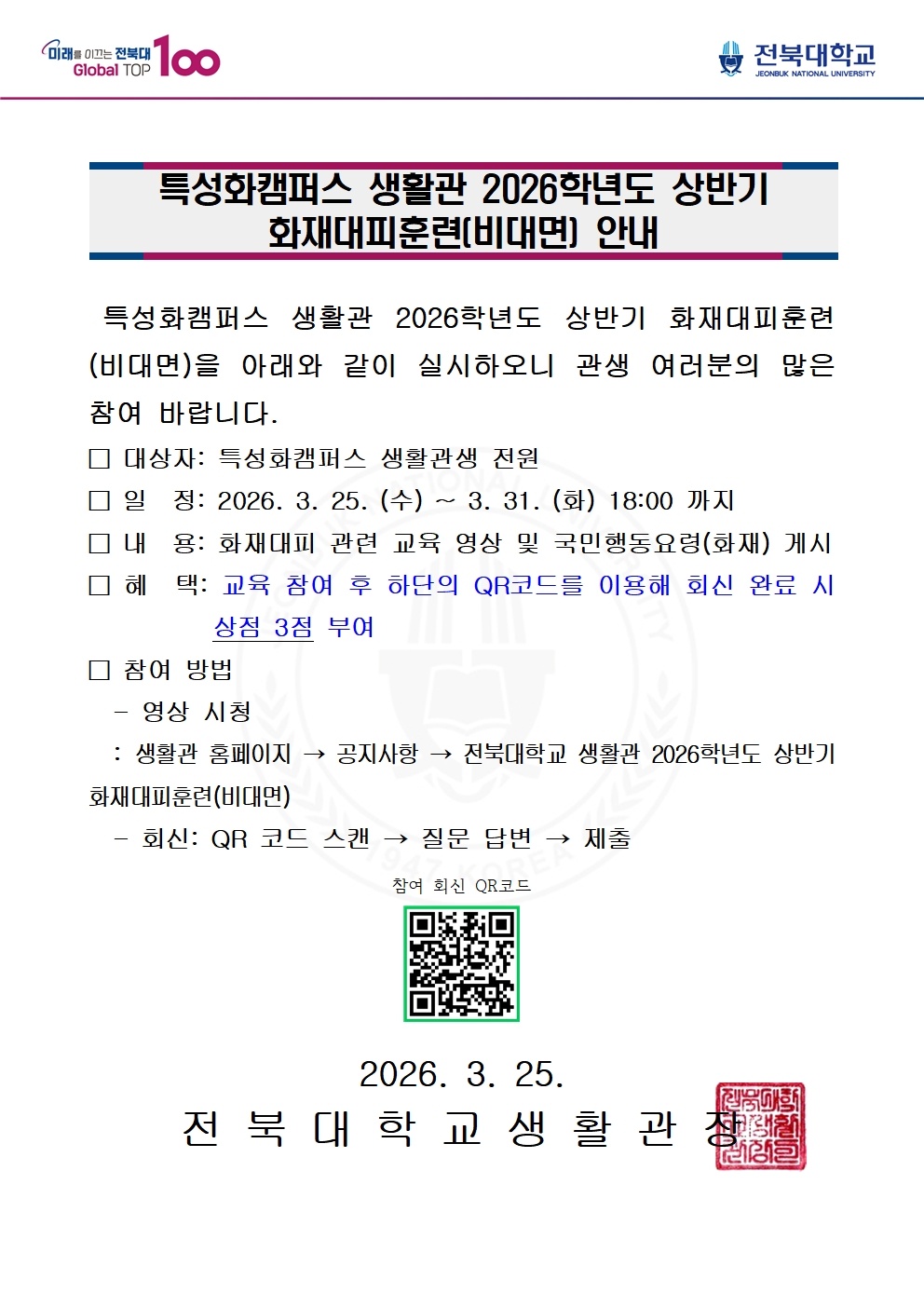 특성화캠퍼스 생활관 2026학년도 상반기 화재대피훈련(비대면) 안내