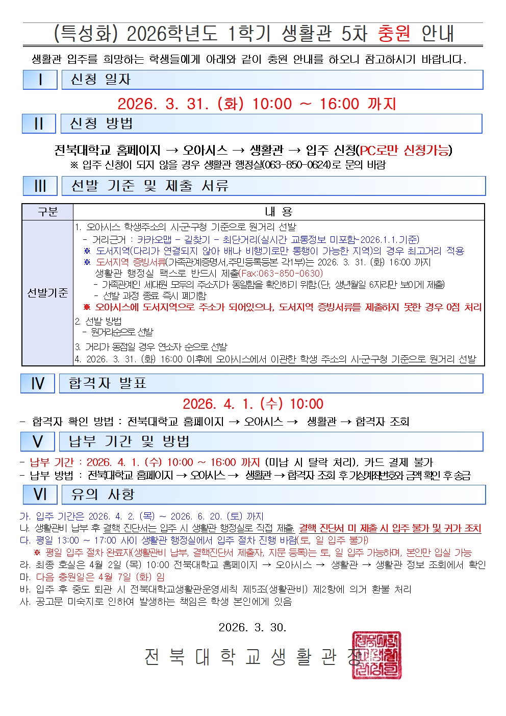 (특성화) 2026학년도 1학기 특성화캠퍼스 생활관 5차 충원 안내