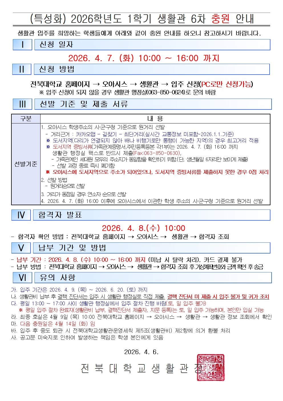 (특성화) 2026학년도 1학기 생활관 6차 충원 안내